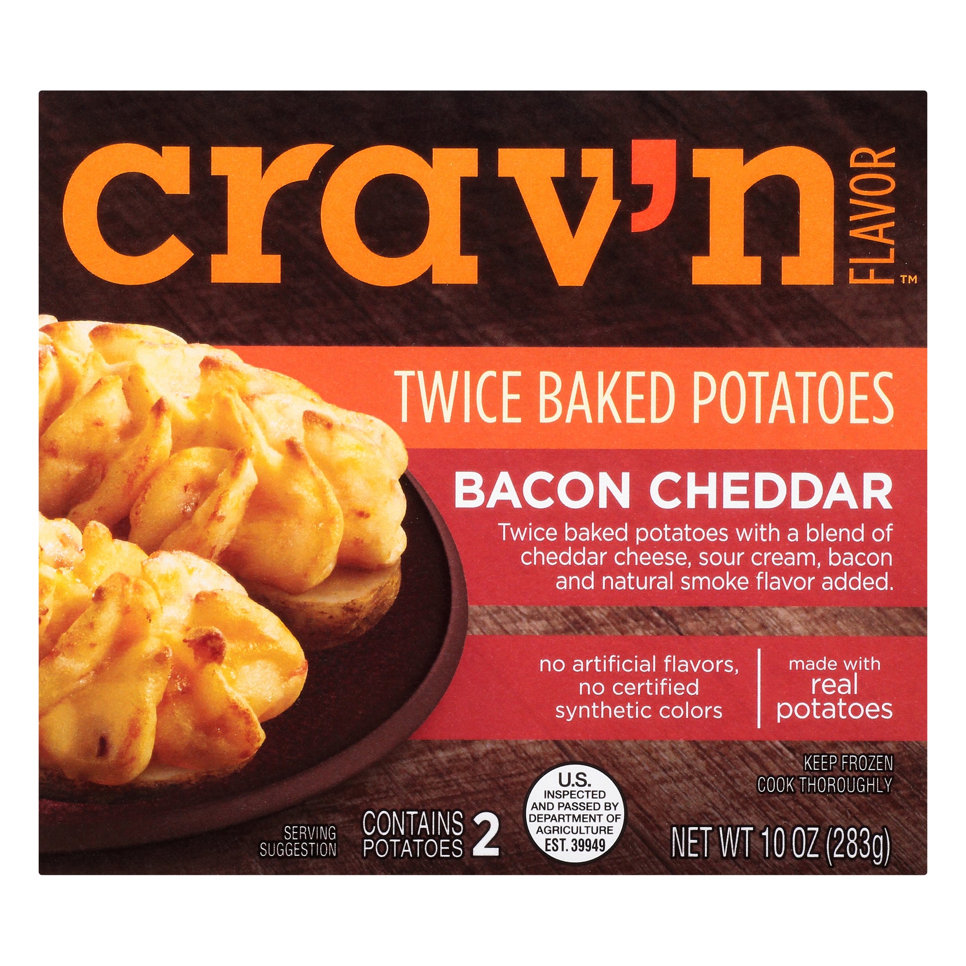 Contains 2 potatoes. Twice baked potatoes with a blend of cheddar cheese, sour cream, bacon and natural smoke flavor added. Made with real potatoes. No artificial flavors, no certified synthetic colors. No certified synthetic colors. Contains 2 potatoes. Get some Crav'n Flavor! Nothing tastes better than the delicious combo of bacon and cheddar with creamy mashed potatoes. These flavorful, no-fuss spuds are the perfect snack or side, no matter what you're making! It's serious satisfaction. Quality Guaranteed: If for any reason you are not satisfied, we'll give you a full refund. U.S. inspected and passed by Department of Agriculture. www.CravnFlavor.com. Scan for more food information or call 1-888-423-0139. Please recycle.
