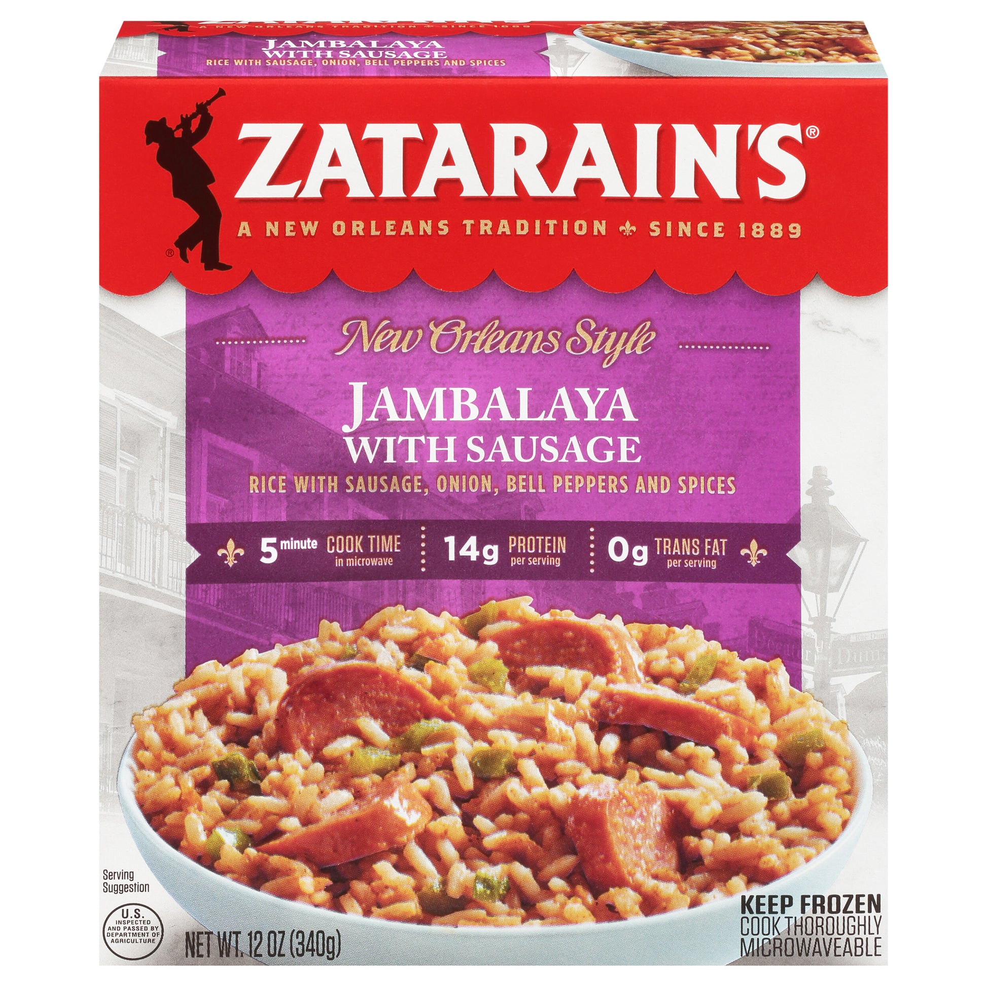 Zatarain's Jambalaya with Sausage brings authentic New Orleans-style flavor from the freezer to the table in minutes. This traditional Creole dish features seasoned rice with sausage, bell peppers and spices, including garlic, paprika and chili pepper. So, if you're in a bind for time, just pop Zatarain's Jambalaya with Sausage in the microwave for a jazzed up meal reminiscent of The Big Easy.